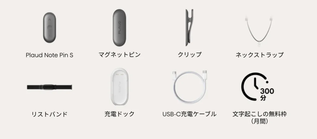 まずは同梱物を確認します。公式サイトに記載されている同梱物は、Plaud NotePin S本体、マグネットピン、クリップ、ネックストラップ、リストバンド、充電ドック、USB-C充電ケーブルです。充電ケーブルは付属しますが、コンセントに挿すUSBアダプターは同梱されていません。手元にない場合は事前に用意しておくとスムーズです。