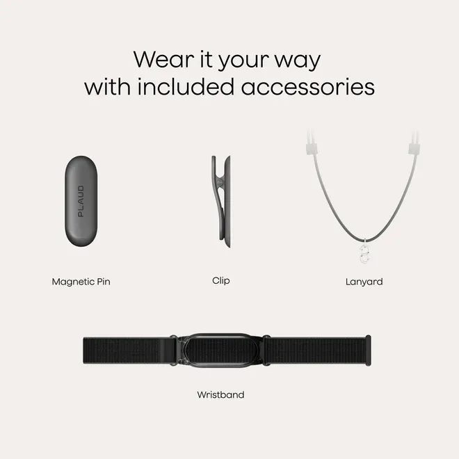 Plaud公式サイト(日本版)でのPlaud NotePin Sの通常価格は税込28,600円です。カラーはブラック・シルバー・パープルの3色から選ぶことができ、4種類のアクセサリーが標準で同梱されています。これにより、ネックストラップ・マグネットピン・クリップなど複数の装着スタイルを箱を開けてすぐに試せるようになっています。