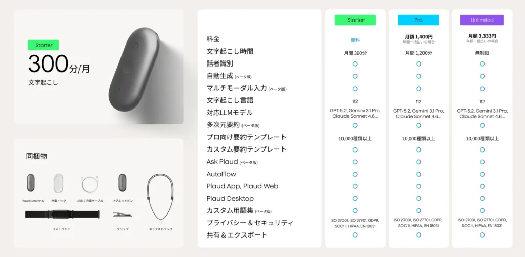 Plaud NotePin Sのプランは、Starter・Pro・Unlimitedの3種類で、違いは主に「月あたりの文字起こし時間」です。