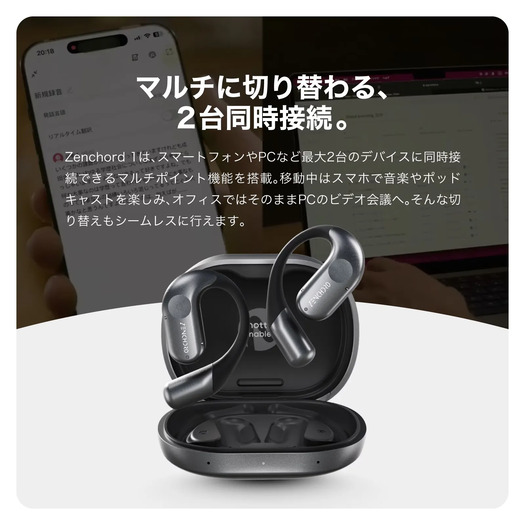 また、PCとスマートフォンを同時に接続できるマルチポイント機能にも対応しているため、PCでのWeb会議中にスマートフォンへ着信があっても、デバイスを付け替えることなく対応可能です。